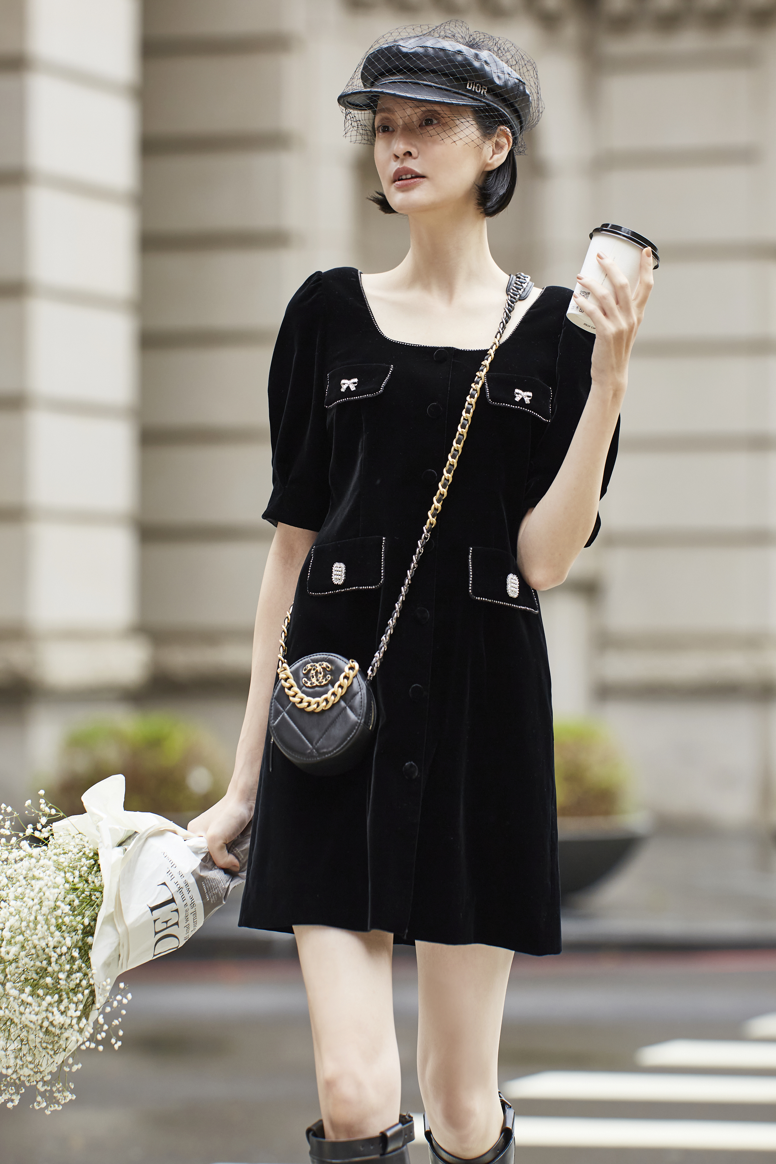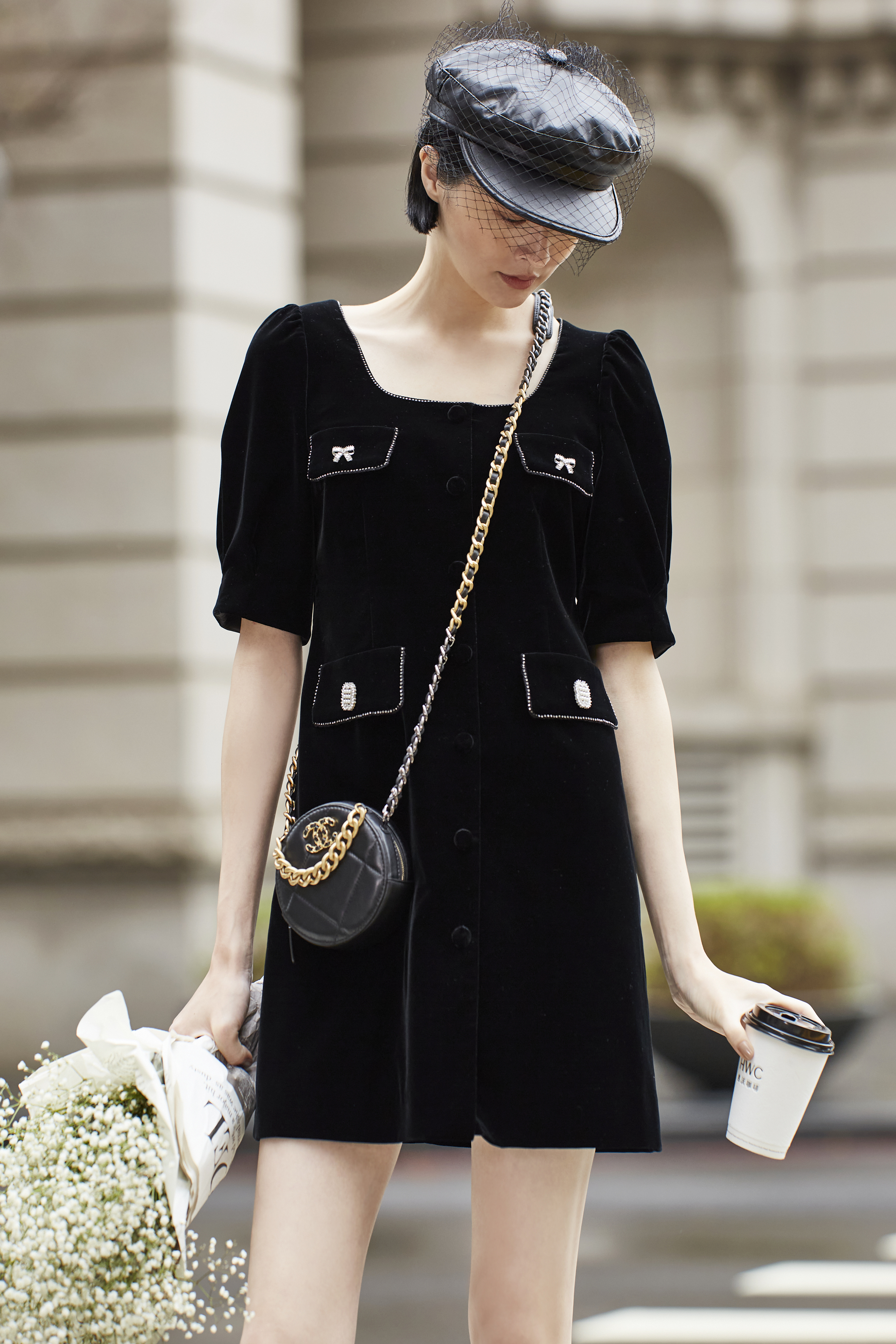 BC15019E1 沙漠星空黑絲絨復古方領泡袖洋裝