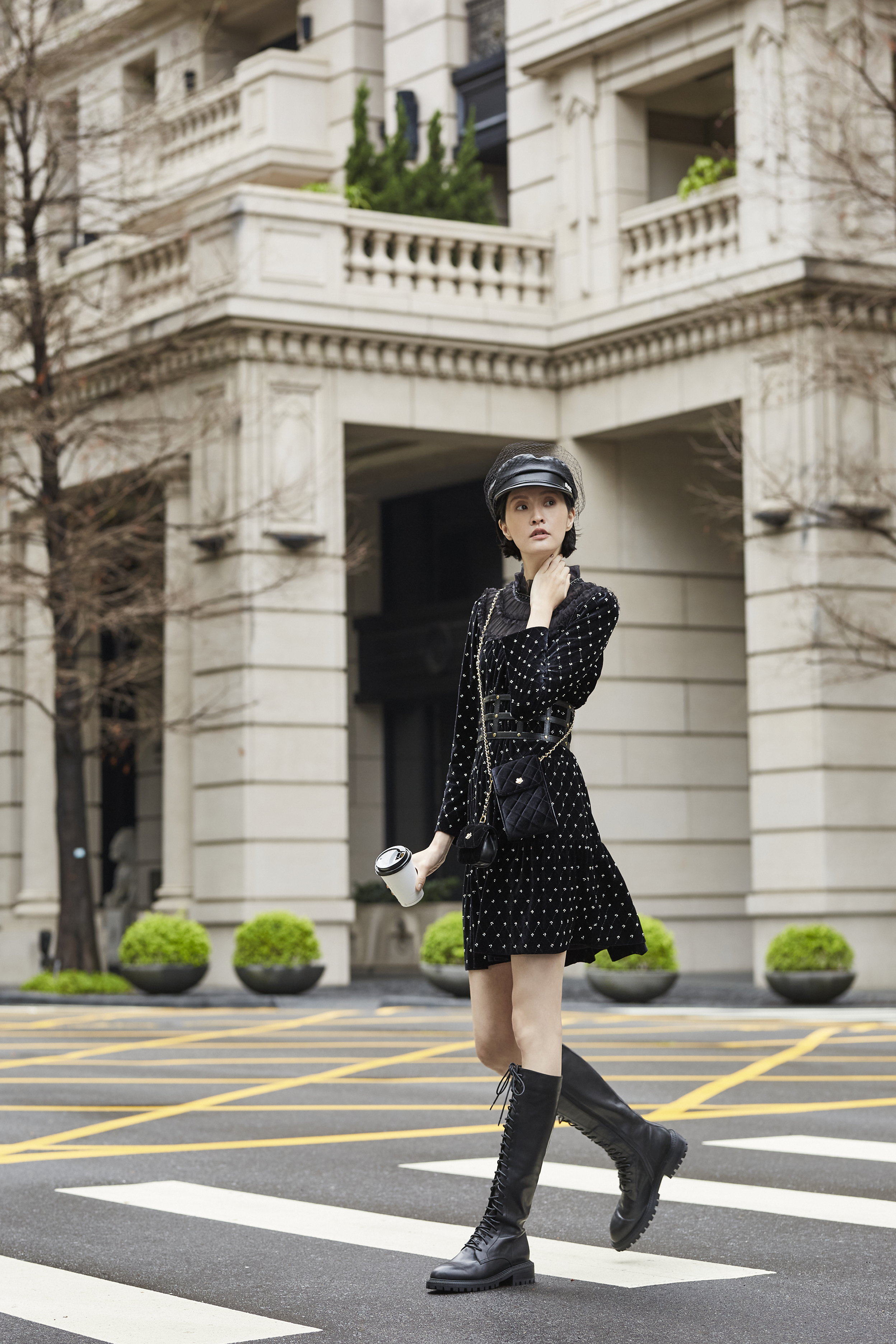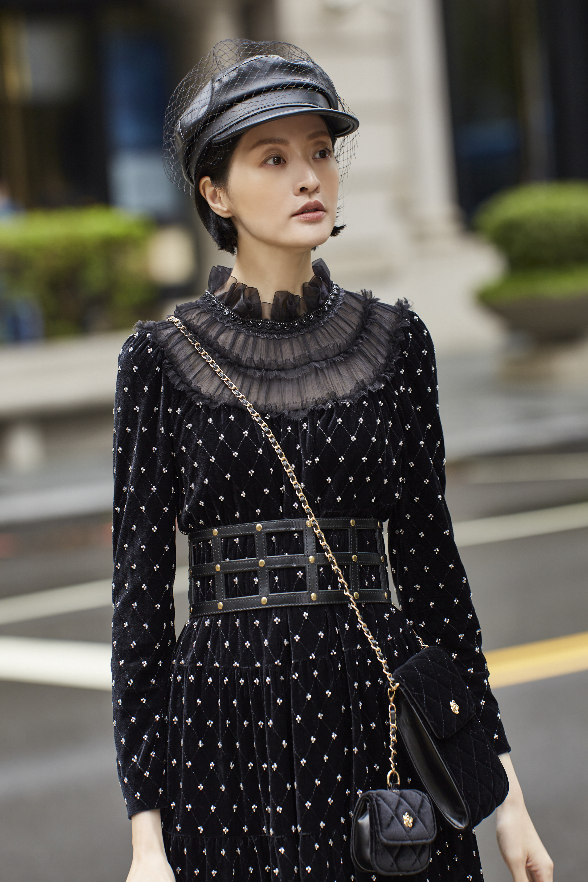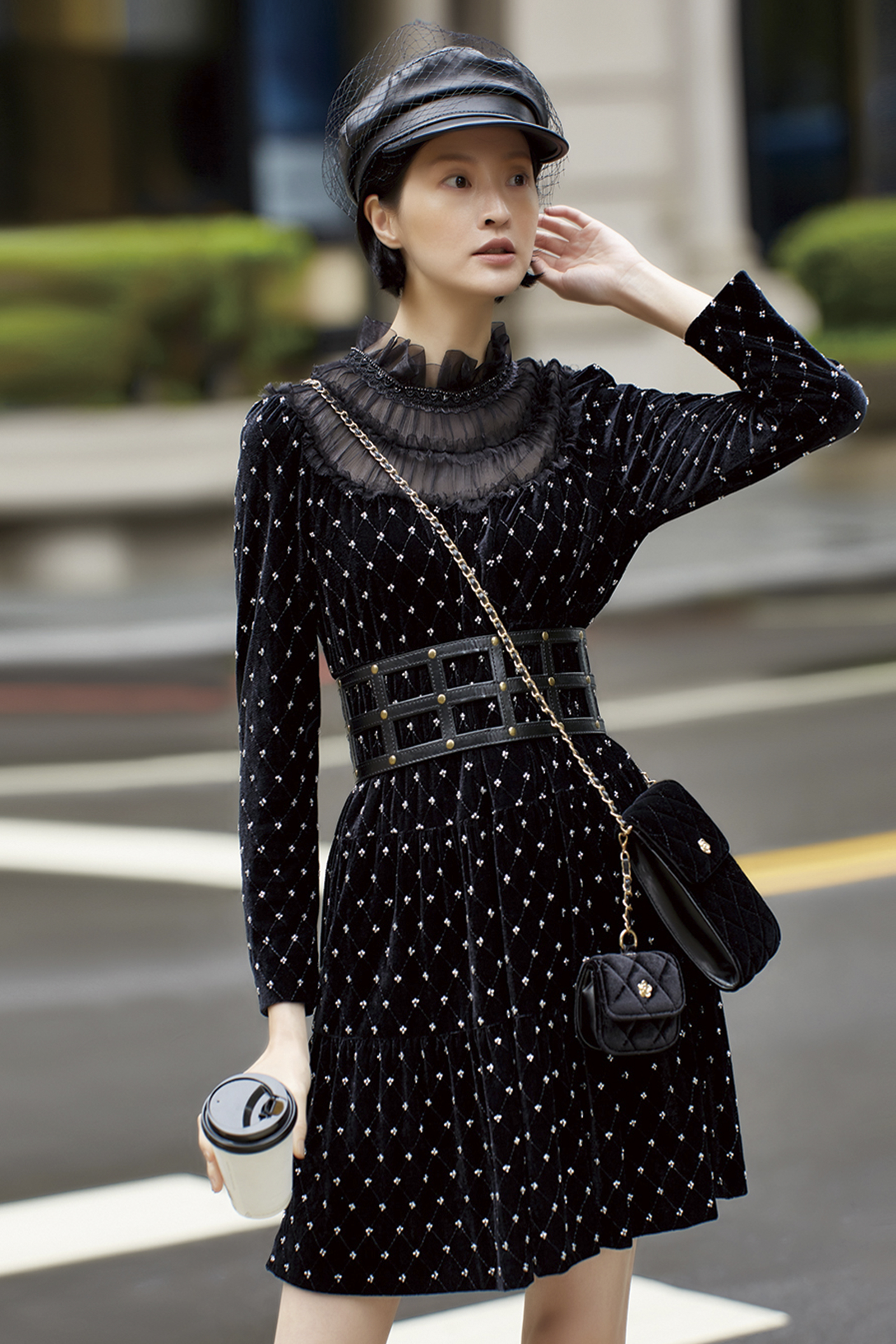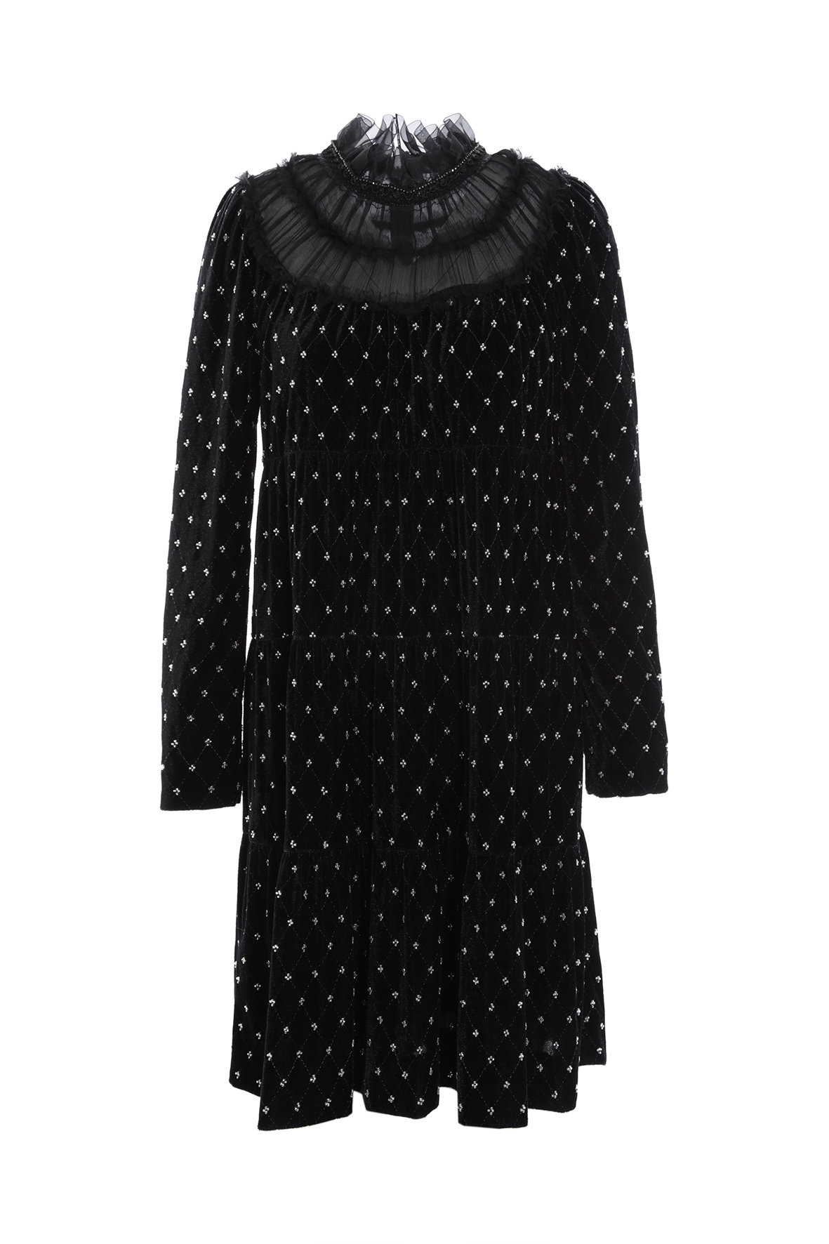 菱格點紋透過織法呈現,而非印刷,使整件洋裝在光影下產生細微層次變化。