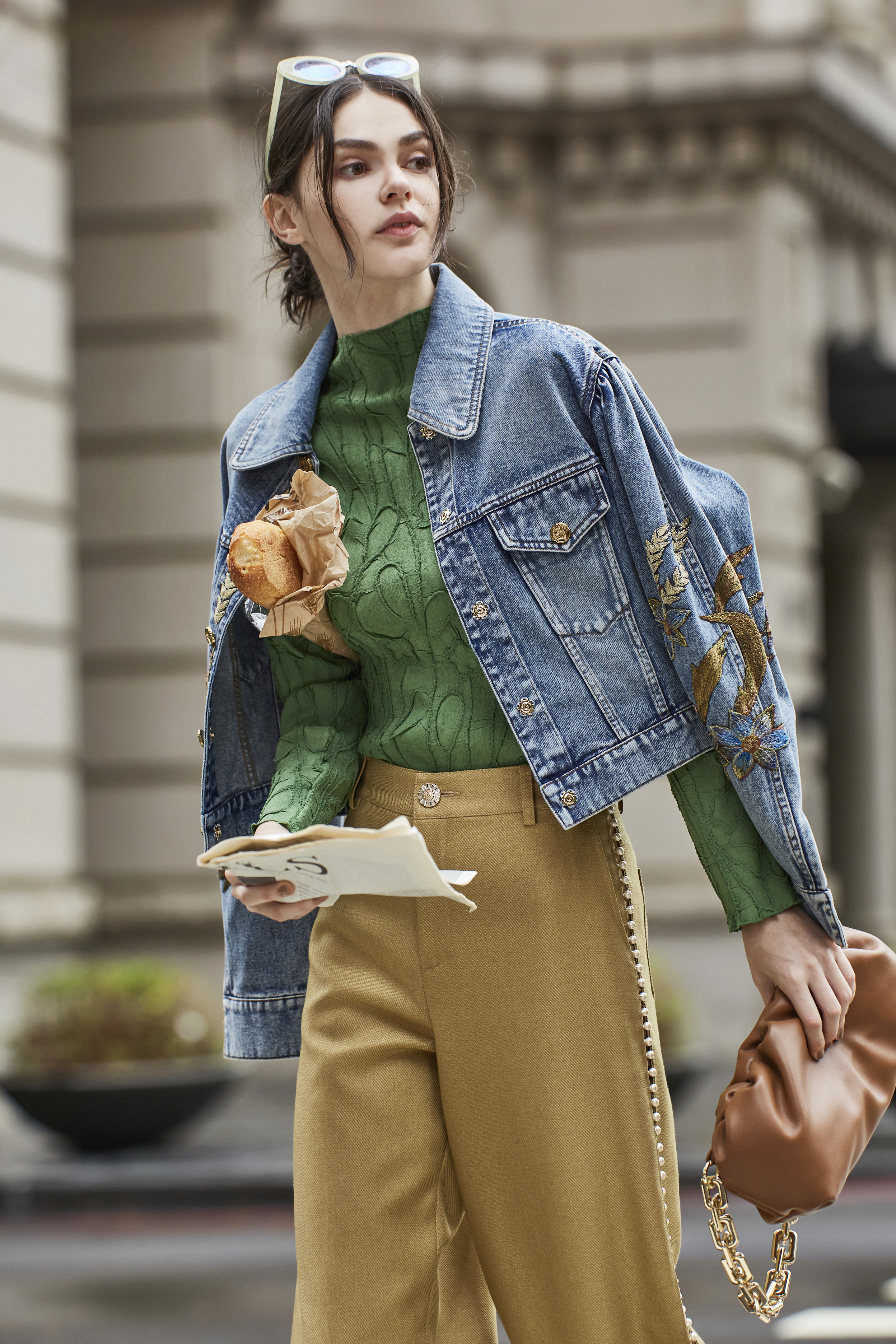 側邊一路延伸的珍珠裝飾,像是一條低調的光軸,讓褲子在走動時產生細微而有節制的閃耀。