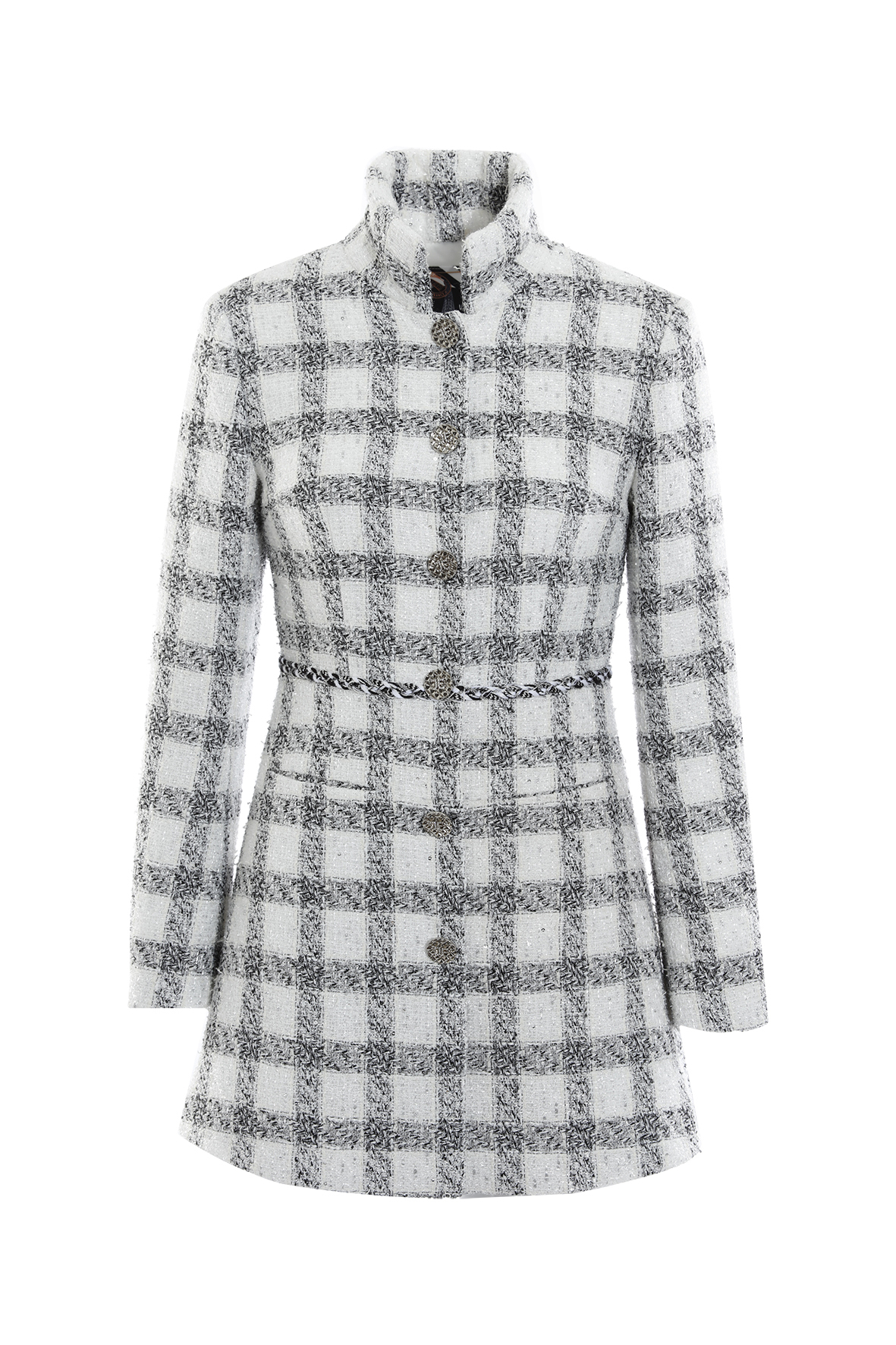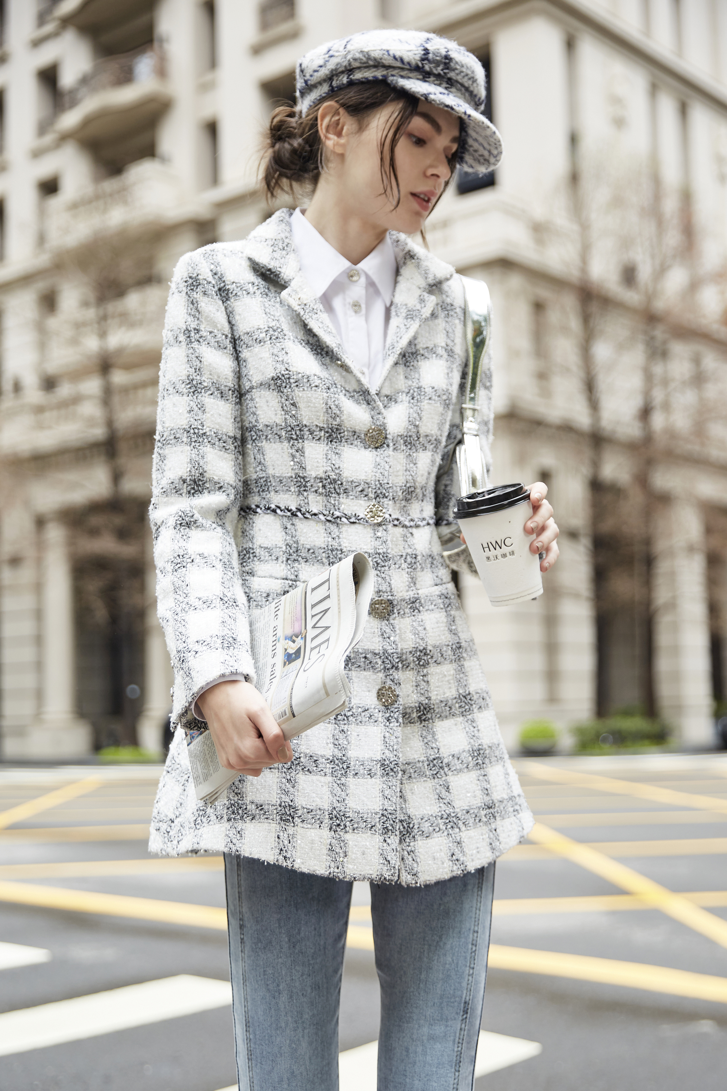 布料為細緻粗花呢(Tweed)格紋織法,表面帶有自然毛感,觸感溫潤、有空氣感,不硬、不刺、不冰冷。