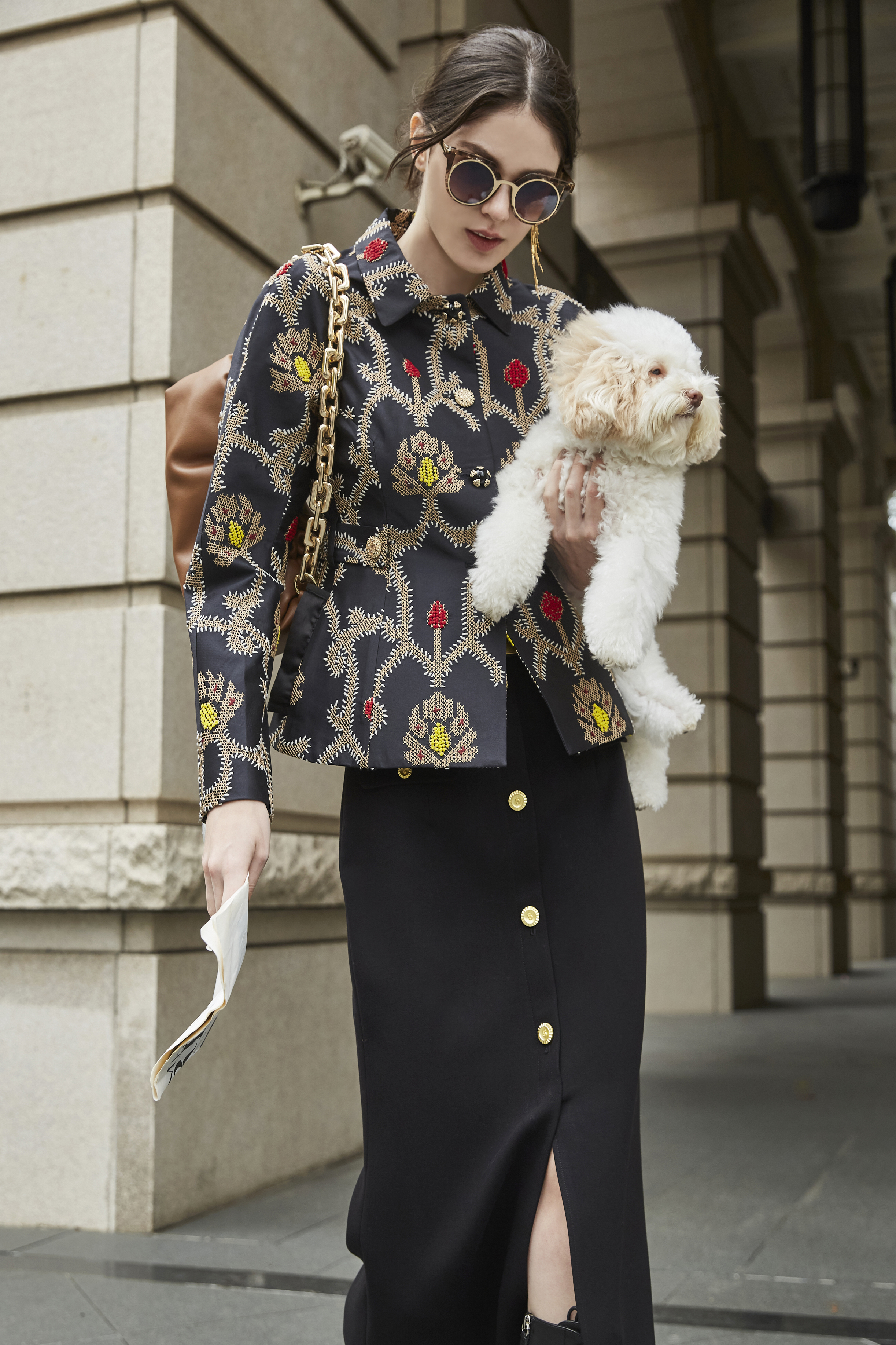 整體輪廓是收腰西裝結構,讓豐富圖騰仍保持俐落,不會失控。
