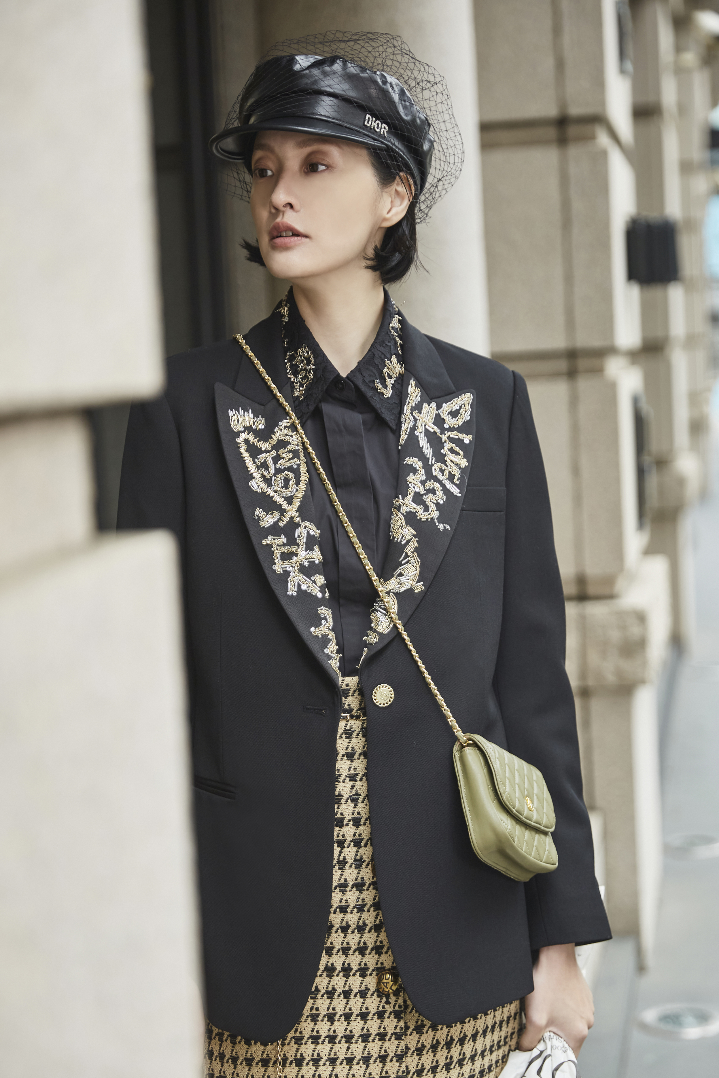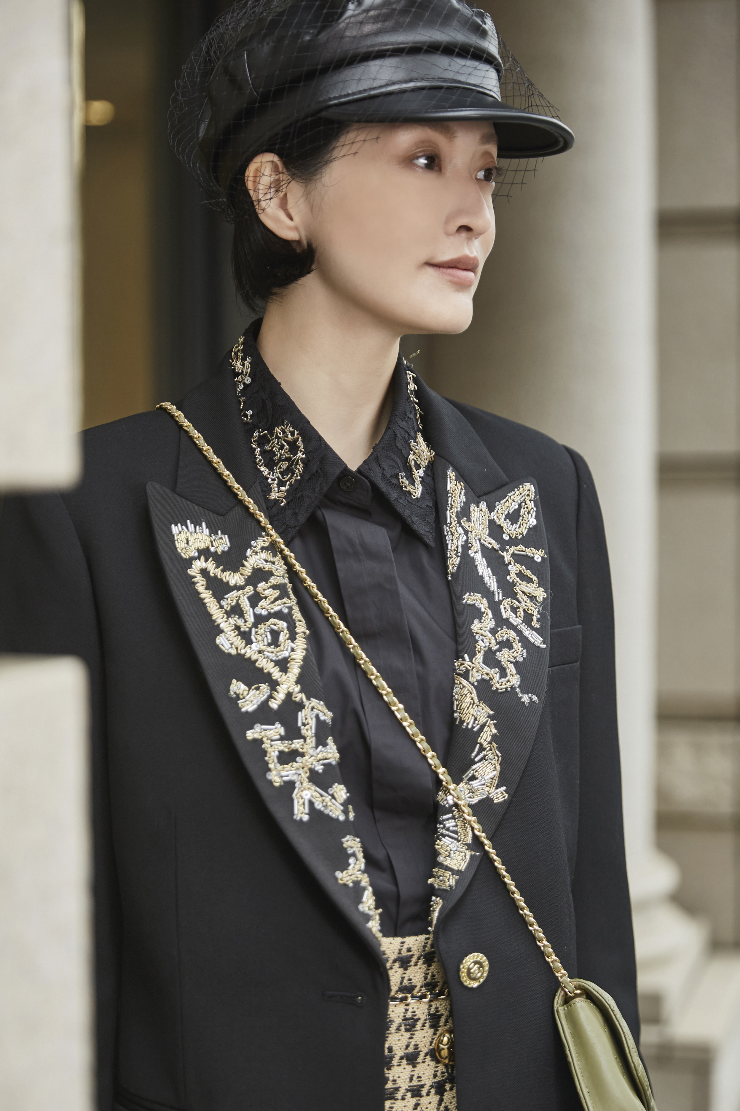 整體以純黑西裝結構為基礎,線條俐落、比例修長;