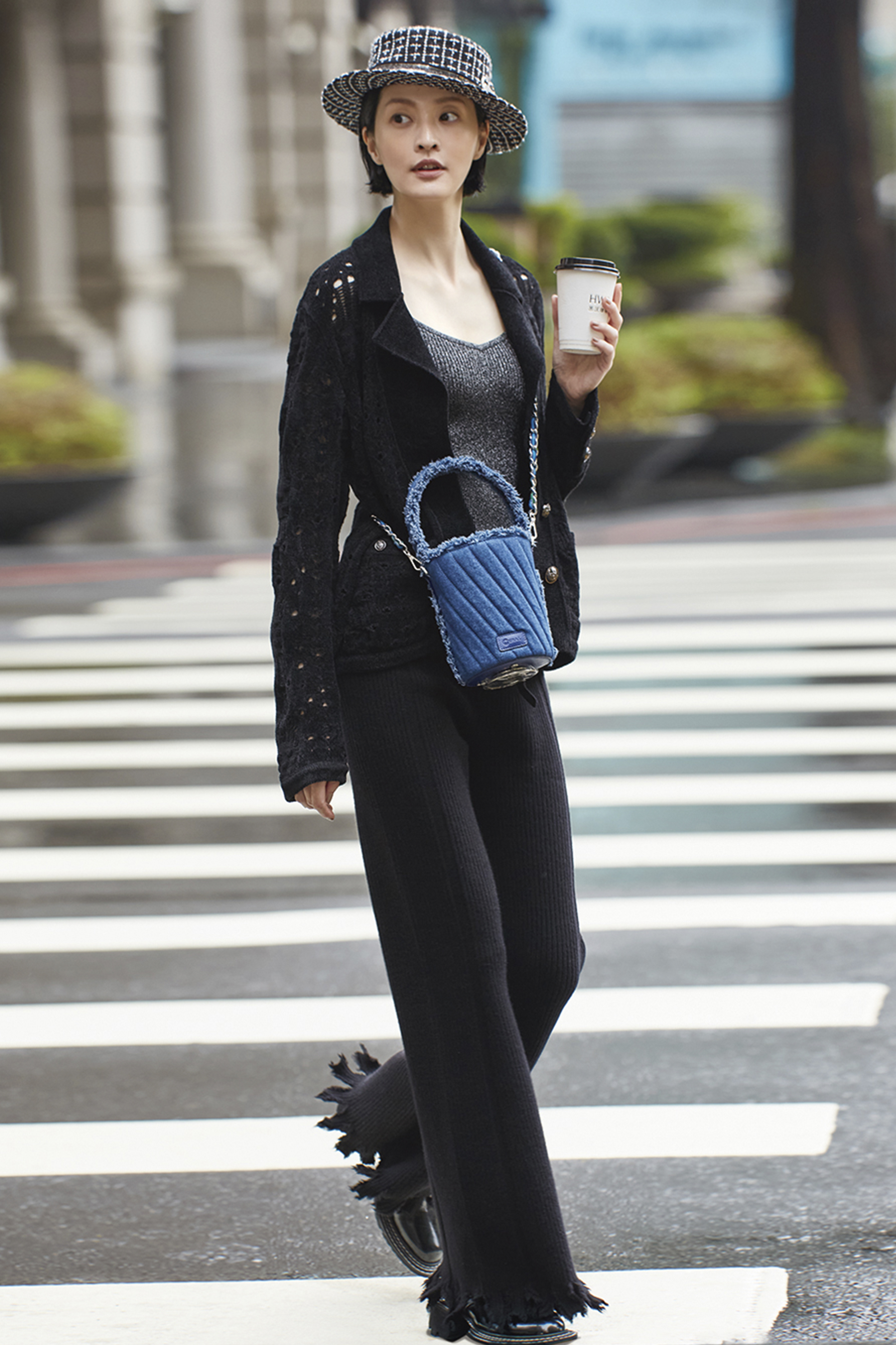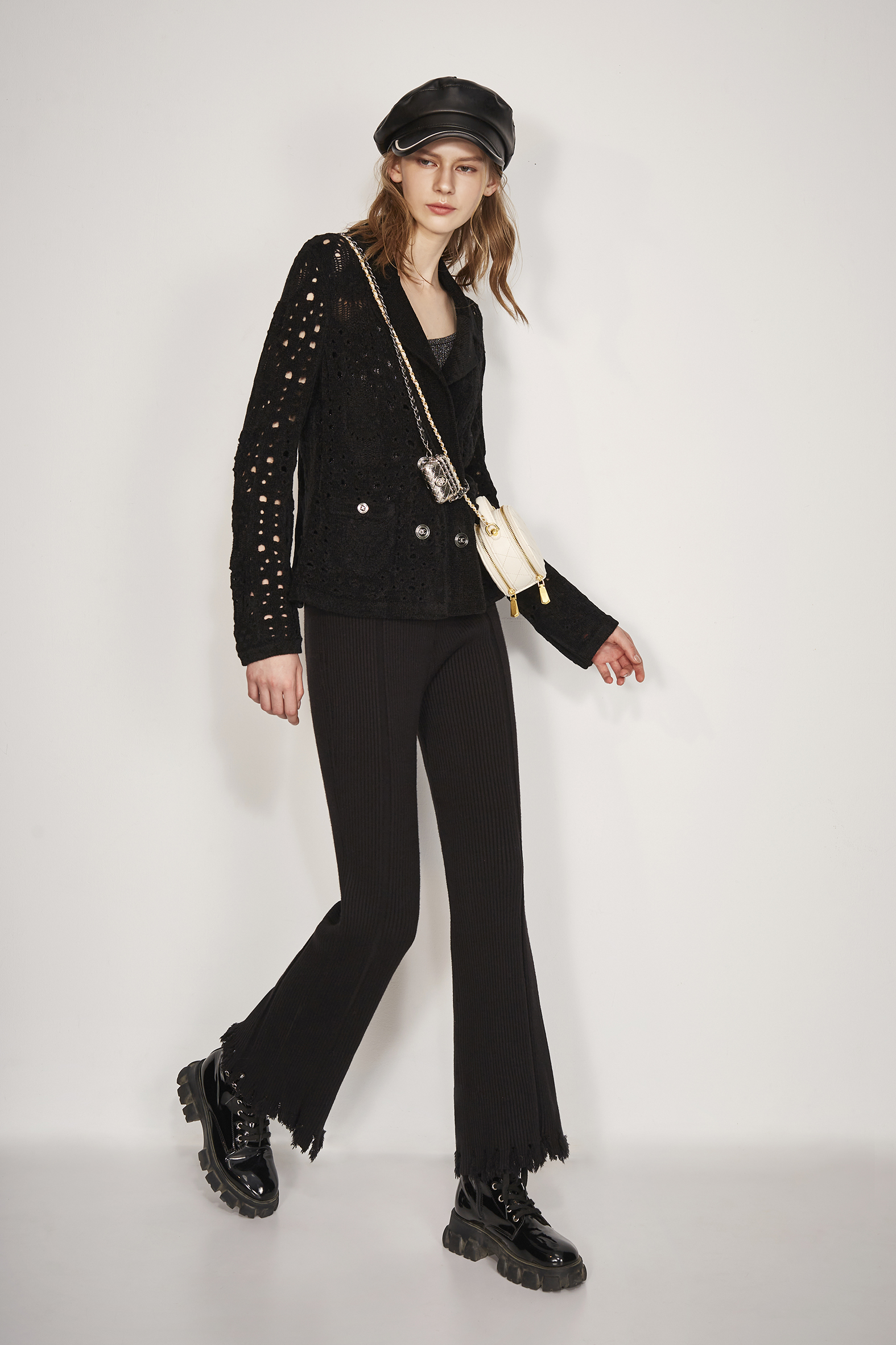 布料為細緻羅紋針織,直向紋理讓腿部線條視覺上被拉長,也讓布料在動作時自然律動。