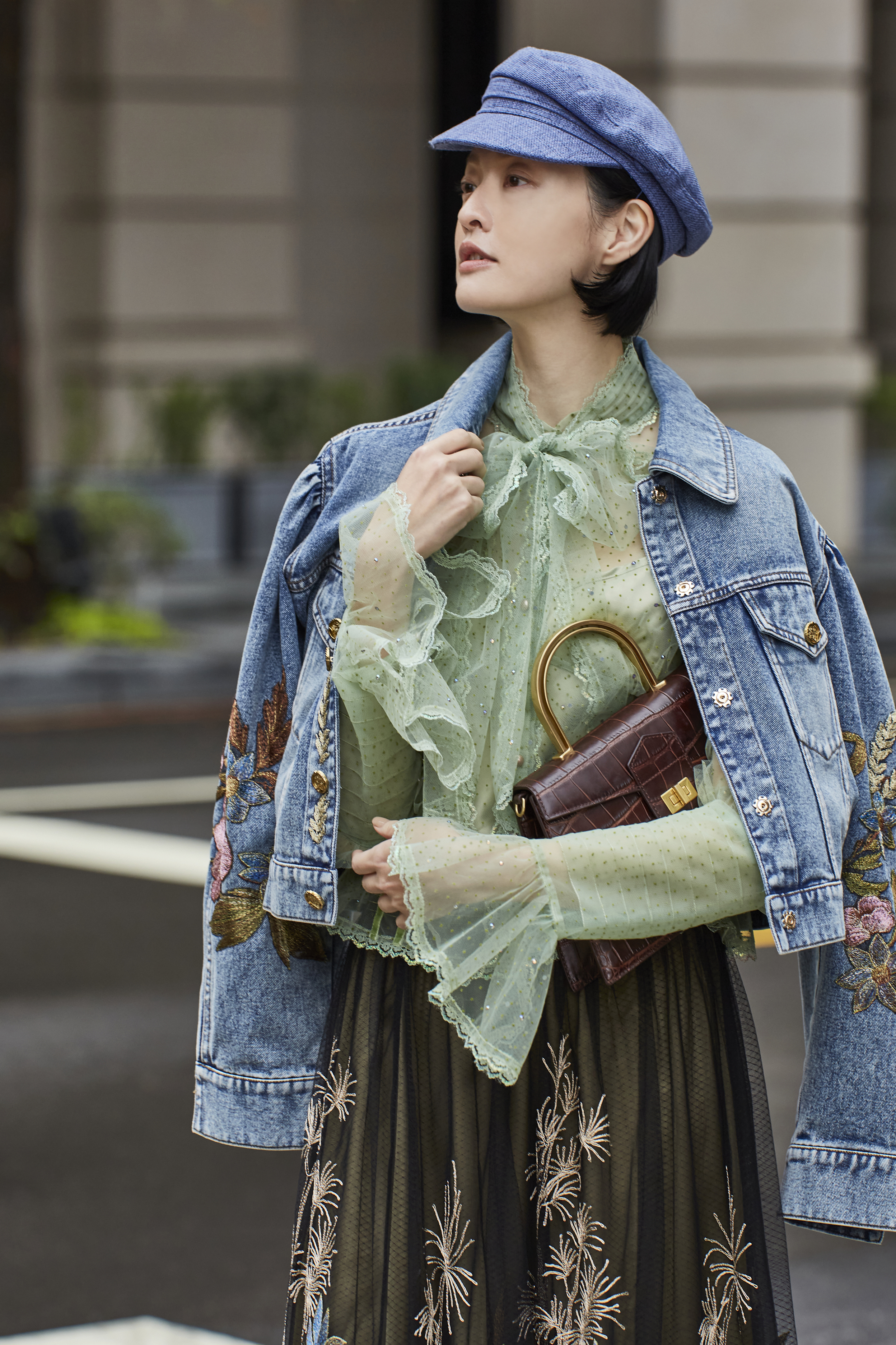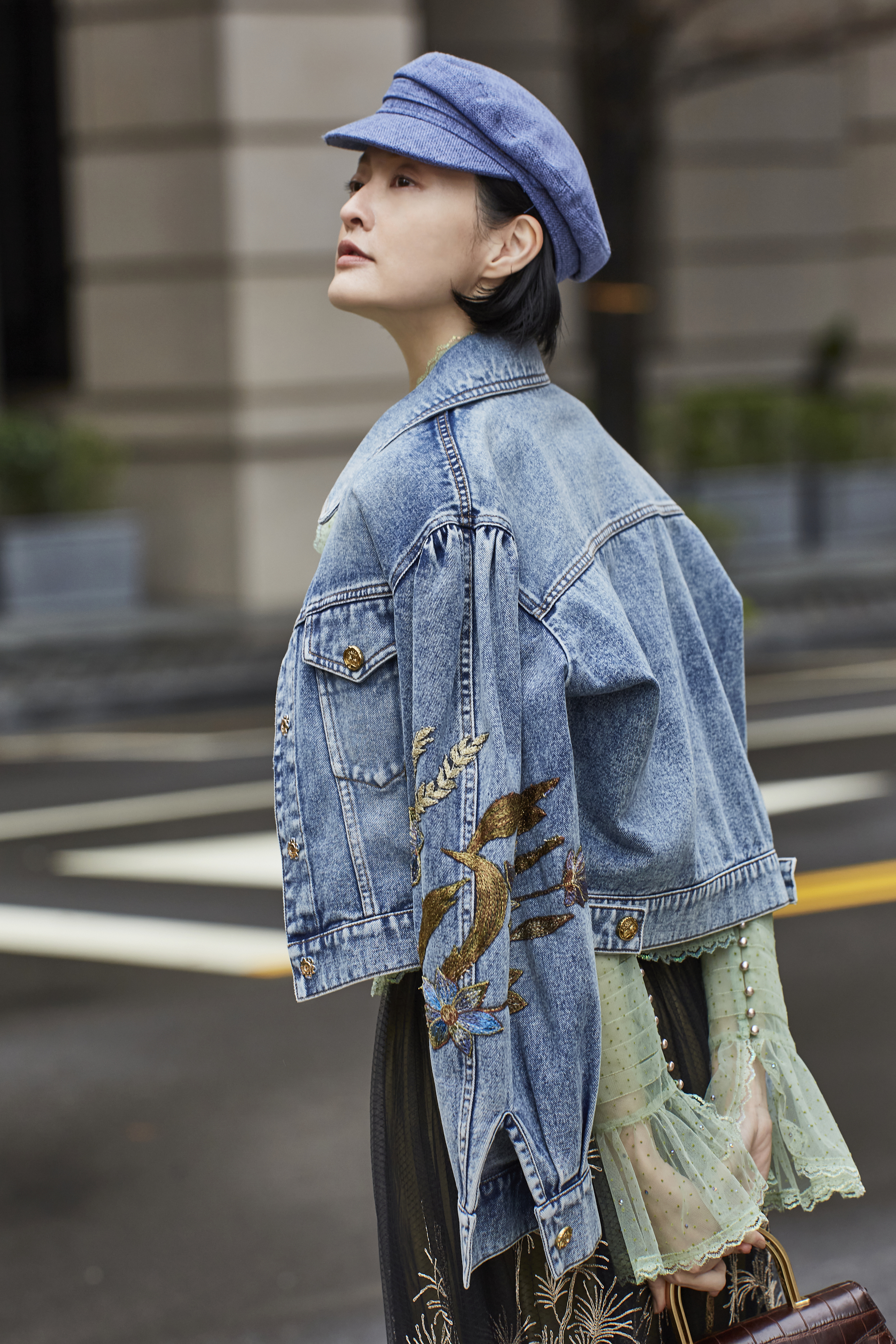 丹寧布料經過洗舊處理,觸感柔軟但仍保有骨性,穿上後不僵硬、不厚重,卻有安全感。