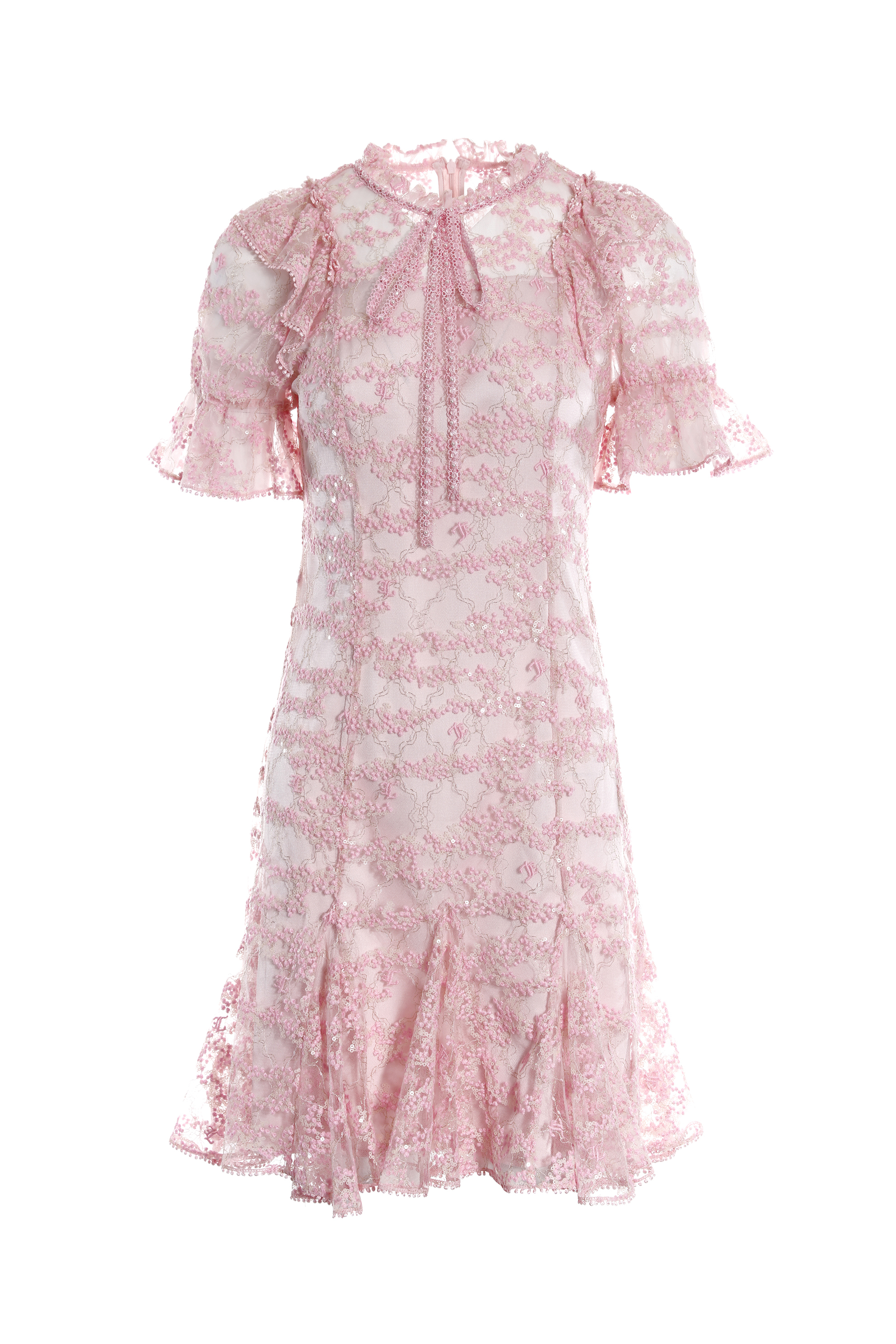 BC1EE118E1粉色春花庭院雙層透膚洋裝