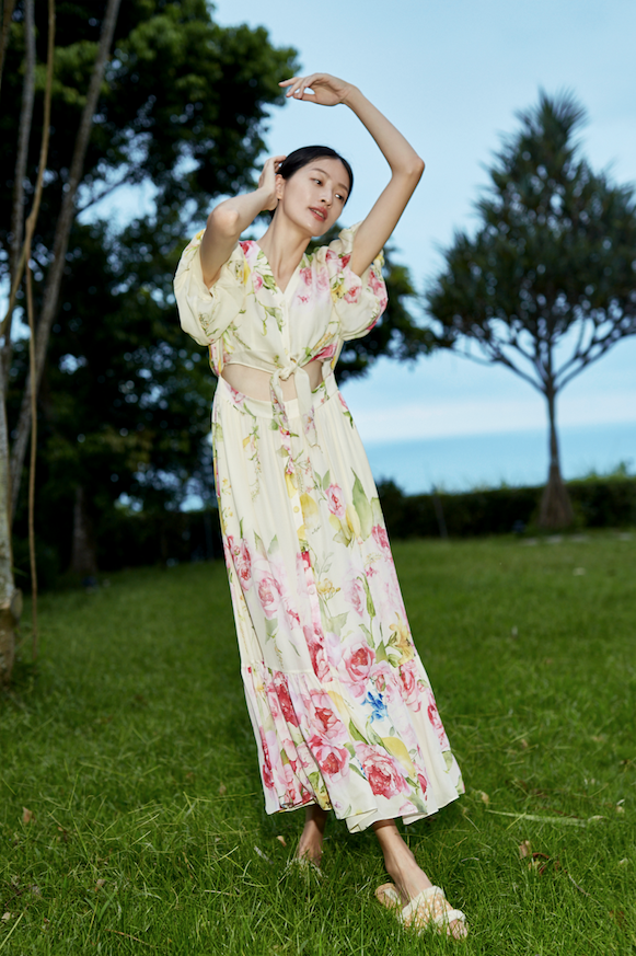 BD10016E1鵝黃色假兩件玫瑰洋裝