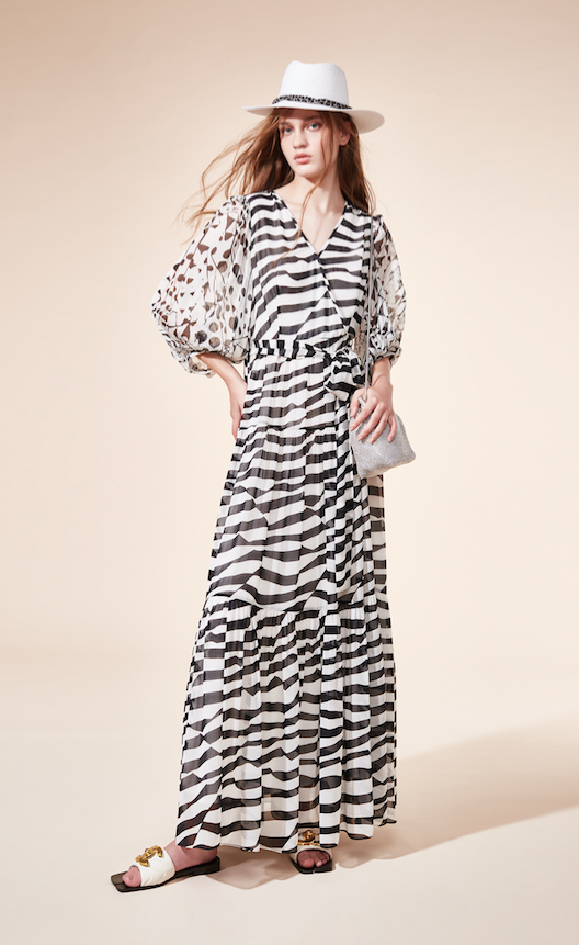 BD10061E1 黑白斑馬紋V領五分澎袖洋裝 (附綁帶)
