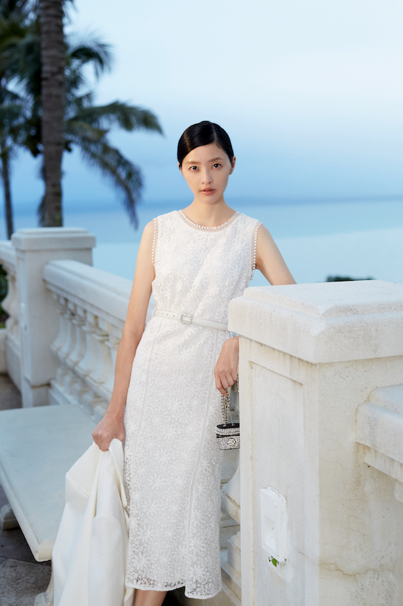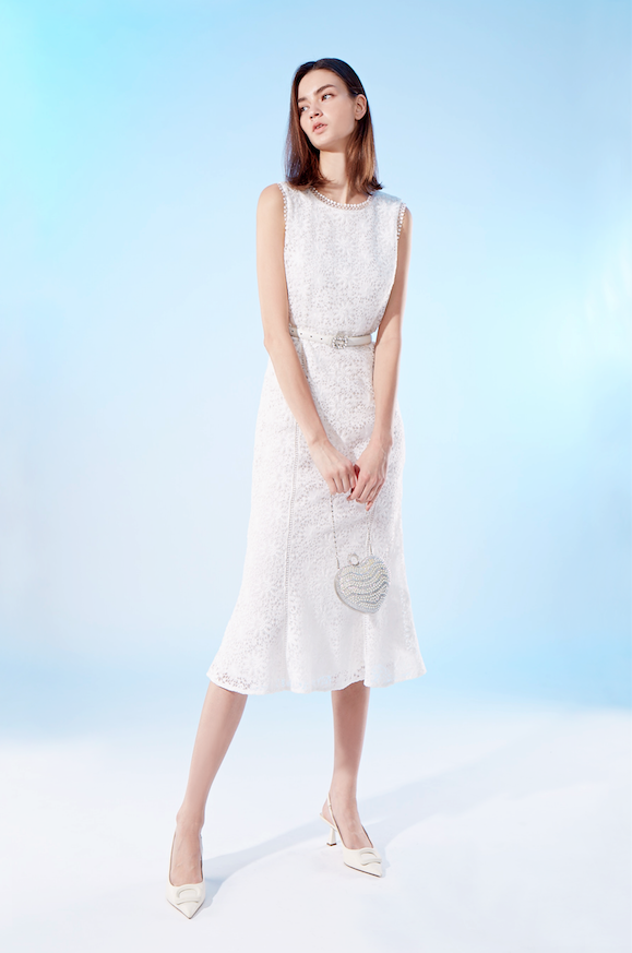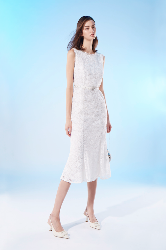 BD10101E1 太陽花刺繡蕾絲收腰長尾洋裝 (附腰帶)